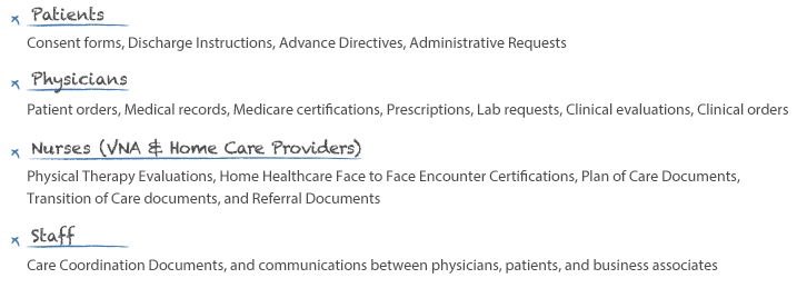 Digital signatures are in use by Hospitals of all sizes, Ambulatory facilities, Remote and mobile staff, Mental healthcare providers and healthcare organizations carrying out clinical trials. Typical documents using digital signatures include: